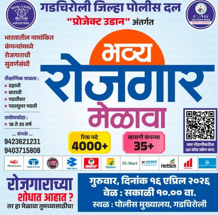 38 कंपन्या करणार 4000 Placement याद्वारे गडचिरोली जिल्ह्यातील दहावी, बारावी, पदवी आणि पदव्युत्तर तरुणांना रोजगाराची संधी प्राप्त होणार आहे. 18 ते 35 वर्षे वयाच्या तरुण तरुणीना नामांकित कंपनीत रोजगार मिळण्याची संधी प्राप्त होणार आहे. हा रोजगार मेळावा 16 एप्रिल 2026 ला आयोजित करण्यात आलेला आहे. ज्या युवकांना placement हवे असेल त्यांनी सकाळी 10.00 वाजता आपले शैक्षणिक दस्ताऐवज घेऊन पोलीस मुख्यालयात उपस्थित राहावे. Project Udan गडचिरोली जिल्हा आता हळूहळू मुख्य प्रवाहात येत आहे. स्थानिक रहिवासी तरुणांना रोजगाराच्या माध्यमातून आपले स्वप्न साकार करण्याची उत्तम संधी प्राप्त होत आहे. एकीकडे बेरोजगारी वाढत असतांना गडचिरोली जिल्हा पोलीस दलाच्या माध्यमातून Project Udan (प्रोजेक्ट उडान) ही नवीन संकल्पना राबविण्यात येत आहे. जवळपास 4000 रिक्त पदांसाठी हे Placement Camp आहे. तरुणांनी पूर्ण तयारीने मुलाखतीला उपस्थित राहणे आवश्यक आहे No Company Name Sector Requirement Qualification Age 1 Mahindra & Mahindra Automotive 300 10th&12th / ITI 18-35 2 JK Maini Presicion Technology Limited Automotive 200 10th /12th / Graduate / ITI / Diploma 18-35 3 Blue Star Limited Electronics 200 Graduate / ITI / Diploma 18-35 4 MSL Driveline System Ltd Automotive 200 12th / ITI / Diploma 18-35 5 Yuvashakti Skill India Pvt Ltd All Sectors 200 10th /12th / Graduate / ITI / Diploma 18-35 6 Yuvashakti Foundation All Sectors 200 10th /12th / Graduate / ITI / Diploma 18-35 7 Hitachi Astemo India Pvt Ltd Automotive 150 10th /12th / ITI / Diploma 18-35 8 Endurance Technologies Automotive Manufacturing 150 ITI / Diploma 18-35 9 Merino Industries Ltd Plywood & Laminates 140 SSC / HSC 18-35 10 MD Industries Automotive 100 10th /12th / Graduate / ITI / Diploma 18-35 11 Taparia Tools Ltd Automotive 100 10th /12th / Graduate / ITI / Diploma 18-35 12 Synnova Gears Transmission Pvt Ltd Auto Component 75 10th/12th/ITI/Diploma/BE/BTech 18-35 13 Rayzon Solar Ltd Solar PV Manufacturing 70 ITI / Diploma (EE/ME) 18-35 14 Glenmark Science Pharma & Botechnology 70 HSC Science 18-35 15 Motherson Automotive Engineering Automative 50 10th /12th / Graduate / ITI / Diploma 18-35 16 MRF Limited Auto Components 50 SSC / HSC / ITI / Diploma 18-35 17 Flash Electronics Electronics 50 Diploma / BE 18-35 18 Anand I Power Automative 50 ITI / Diploma 18-35 19 HLE Giascoat Ltd SS Tank Manufacturing 40 ITI (Fitter) 18-35 20 Timken India Ltd Bearing & Industrial Motion 40 SSC / HSC / ITI / Diploma 18-35 21 Bajaj Sons Ltd Automotive 30 12th / ITI / Diploma 18-35 22 Jakson & Co DG Set Assembly 30 Degree / ITI 18-35 23 Hettich India Pvt Ltd Manufacturing 30 SSC / HSC / ITI 18-35 24 Gadre Marine Export Pvt Ltd Food Processing 25 HSC / Degree / Diploma 25 Deepak Novochem Specialities Ltd Life Sciences 20 B.Sc. Chemistry 18-25 26 Tata Motors Trainee Mechatronics 300 12th / ITI 18-25 27 Bajaj Pvt Trainee Trainee 100 ITI / Diploma 18-25 28 Bajaj Pvt Trainee Trainee 100 ITI / Diploma 18-25 29 Flat Motors Trainee Trainee 100 12th / ITI 18-25 30 Whirlpool Trainee Trainee 50 10th / 12th 18-25 31 Whirlpool Trainee BE Tech 50 ITI 18-25 32 Whirlpool Trainee Be Tech 50 Diploma 18-25 33 Whirlpool Trainee Trainee 50 BE 18-23 34 Tata Moto Traninee Mechatronics 400 12th / ITI 18-25 35 Tata Battery Traniee Mechatronics 100 ITI / Diploma 18-25 36 Flipcart 200 12th to PG 37 D-Mart Store Promotor 10th / 12th 18-27 38 Ketan Motors Pvt. Ltd Automotive 20 Graduate / ITI / Diploma 21-35
