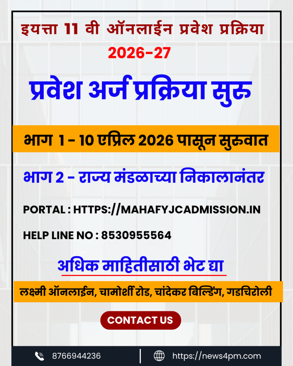 Finally. इयत्ता १० वी परीक्षेस प्रविष्ट झालेल्या राज्य मंडळाच्या विद्यार्थ्यांसाठी महत्वाची सूचना. इयत्ता ११ वी च्या प्रवेशासाठी ऑनलाईन प्रक्रिया सुरु झाली आहे. १० एप्रिल २०२६ पासून Students Registration सुरु झालेले आहे. परीक्षेच्या निकालानंतर प्रवेश प्रक्रियेचा भाग २ सुरु होणार आहे. विद्यार्थ्यांनी आपले Registration करून घेण्याचे आव्हाहन करण्यात आलेले आहे.