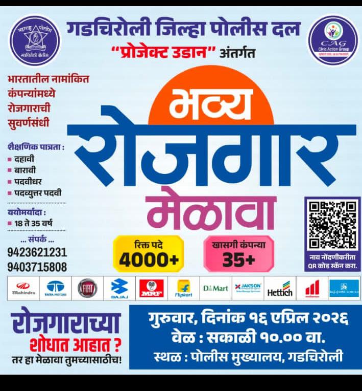याद्वारे गडचिरोली जिल्ह्यातील दहावी, बारावी, पदवी आणि पदव्युत्तर तरुणांना रोजगाराची संधी प्राप्त होणार आहे. 18 ते 35 वर्षे वयाच्या तरुण तरुणीना नामांकित कंपनीत रोजगार मिळण्याची संधी प्राप्त होणार आहे. हा रोजगार मेळावा 16 एप्रिल 2026 ला आयोजित करण्यात आलेला आहे. ज्या युवकांना placement हवे असेल त्यांनी सकाळी 10.00 वाजता आपले शैक्षणिक दस्ताऐवज घेऊन पोलीस मुख्यालयात उपस्थित राहावे.