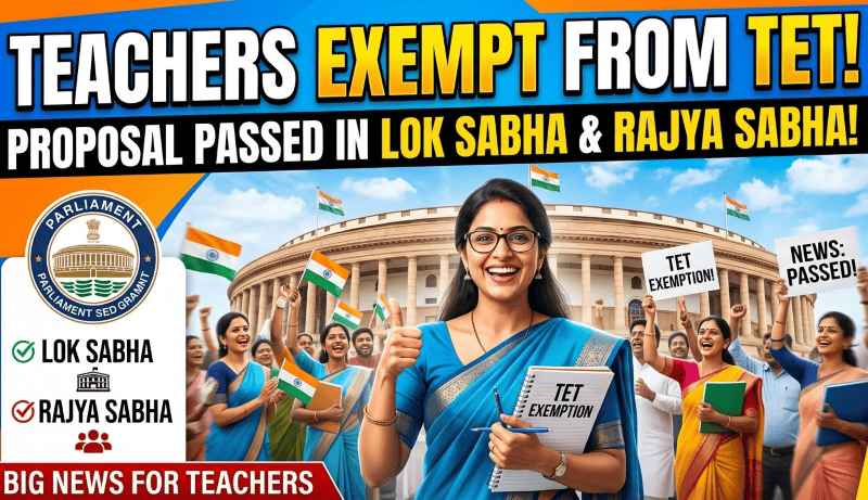 शिक्षकांसाटी अत्यंत आनंदाची बातमी. शिक्षकांना TET मधून मिळणार शिक्षकांना सूट . लोकसभा आणि राज्यसभेत प्रस्ताव पारित करण्यात आला आहे. संसद सत्राच्या शेवटच्या दिवशी RTE Act 2026 मध्ये मोठा बदल करण्यात आलेला. यामुळे देशातील लाखो शिक्षकाना मोठा दिलासा मिळाला आहे.